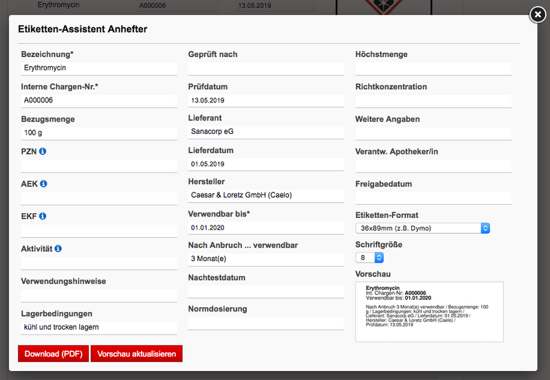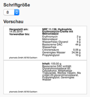 Der Etiketten-Assistent in der Rezeptur wurde um eine Vorschau-Funktion ergänzt, damit der Nutzer sich vorgenommene Änderungen schnell und übersichtlich anzeigen lassen kann. Daneben gibt es nun die Möglichkeit, die Schriftgröße der erzeugten Etiketten frei festzulegen.