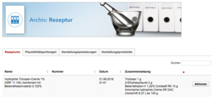 In diesen Archiven können Sie eine Rezeptur/Defektur öffnen und erhalten alle zugehörigen Dokumente aufgelistet. Bei Bedarf können Sie an dieser Stelle auch den Namen und die Nummer der Rezeptur/Defektur ändern. Ab sofort lassen sich dort ganze Rezepturen/Defekturen löschen. Achtung, es werden in Folge alle zugehörigen Dokumente gelöscht.