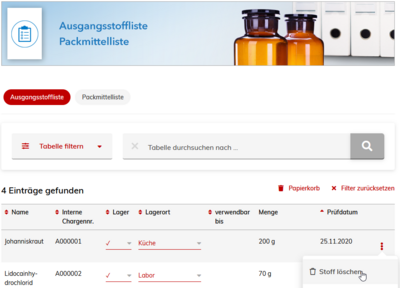 Sie haben auch die Möglichkeit Ihre Listen "aufzuräumen" und so können Sie z.B. bereits verbrauchte oder entsorgte Ausgangsstoffe und Packmittel in den Papierkorb verschieben. Über den Punkt Papierkorb können sie wiederum auch diesen verwalten und z.B. gelöschte Artikel wiederherstellen.