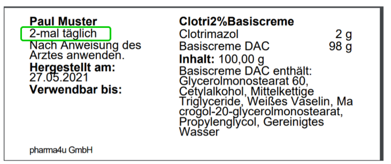 Die in der Eingabemaske angegebene Dosierung wird nun automatisiert in das Herstellungsprotokoll und das Etikett übernommen. Sie finden die Angaben zur Dosierung im Herstellungsprotokoll im neuen Abschnitt „5. Dosierung/Gebrauchsanweisung“.