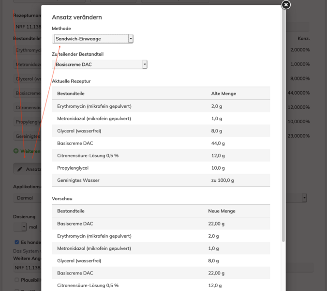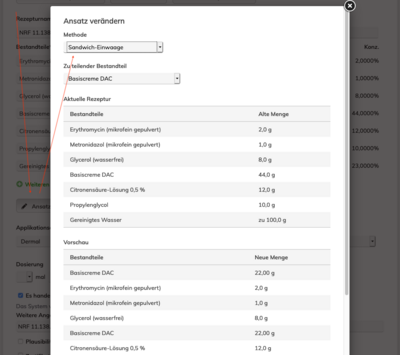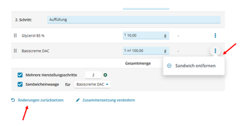 Ab sofort legen Sie in der Herstellungsanweisung fest, ob eine Rezeptur im Sandwichverfahren hergestellt werden soll. Ihre gewählte Grundlage wird dann geteilt und Sie können nach Wunsch konkrete Mengen der Sandwichteile angeben oder ein “q.s.” belassen. Der Stoff ist in der Herstellungsanweisung und im Protokoll mit einem “S” markiert.