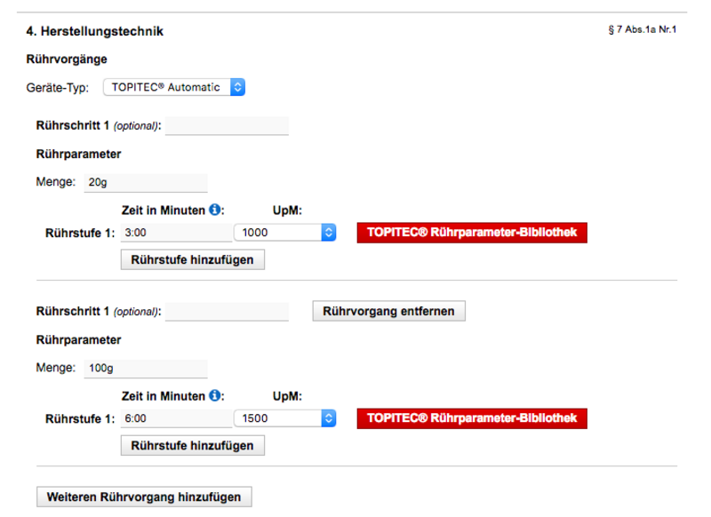 Unsere Herstellungsanweisungen für TOPITEC® und Unguator® wurden erweitert. Nun können Sie bequem die Parameter für mehrere Rührvorgänge während einer Herstellung festlegen, z.B. wenn Sie zunächst anreiben und später einen weiteren Mischvorgang starten. Bei Bedarf lassen sich einfach weitere Rührvorgänge hinzufügen. So können Sie auch komplexere Herstellungen abbilden.