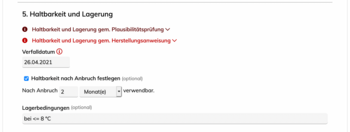 Im Bereich Plausibilitätsprüfung wurden im Abschnitt Aufbrauchfrist einige Änderungen vorgenommen. Zur Vereinheitlichung werden nun die Felder Aufbrauchfrist, Laufzeit und Lagerbedingungen immer gleich angezeigt. Hier sollten Sie die Haltbarkeit Ihrer Zubereitung festlegen.