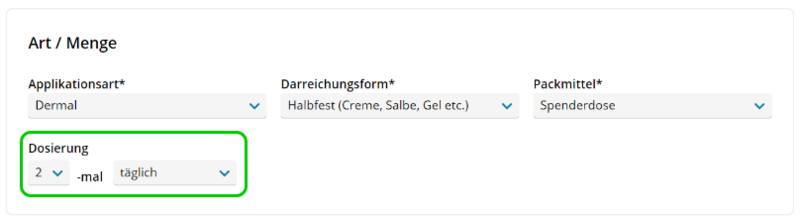 Standardisierte Rezepturen können nun in der Eingabemaske gesucht, ausgewählt und einfach dokumentiert werden, inkl. Herstellungstechnik und Kennzeichnung nach NRF.