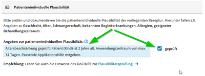 Vermerken Sie bei einer neuen Rezeptur direkt im Plausi-Ergebnis die relevanten Patientenangaben in Bezug auf die Rezeptur. Hierunter fallen z.B. Anwendungsbeschränkungen bei Kindern oder relevante Begleiterkrankungen. Setzen Sie danach das Häkchen bei „geprüft“.