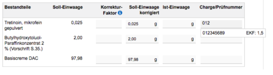 Auswahl und einfache Übernahme der Chargennummern und Einwaagekorrekturfaktoren von geprüften Stoffen ins Herstellungsprotokoll.