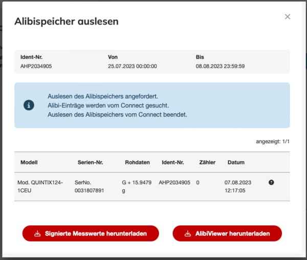 Der Alibispeicher des ausgewählten apotec® Connect wird nun ausgelesen. Sie können die angezeigten Werte mit dem Button „Signierte Messwerte herunterladen“ auf Ihrem Rechner speichern und mit dem AlibiViewer prüfen.