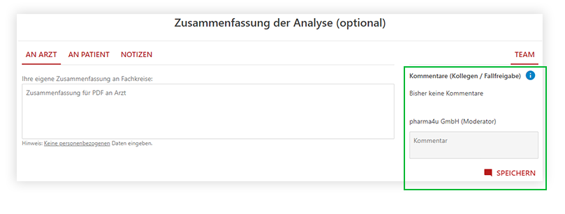 Hinweis: Über die Kommentarfunktion im Bereich “TEAM” im Ausgabeergebnis (s. unten) können alle Kolleg*innen, denen der Fall freigegeben wurde, die Kommentare der anderen mitverfolgen. Die Kommentare werden nicht in das PDF an Arzt / Ärztin oder Patient*in übernommen.