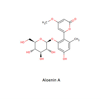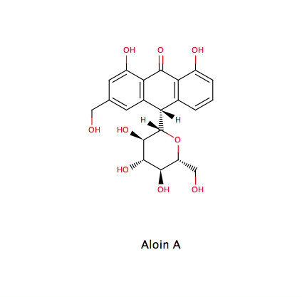 - 12-25% Hydroxyanthracenderivate (nach AB mindestens 18%): Aloin (Barbaloin = Gemisch der beiden Diastereomere Aloin A und B), Aloeemodin, Chrysophanol, 5-Hydroxyaloin (7-Hydroxyaloin fehlt dagegen)
