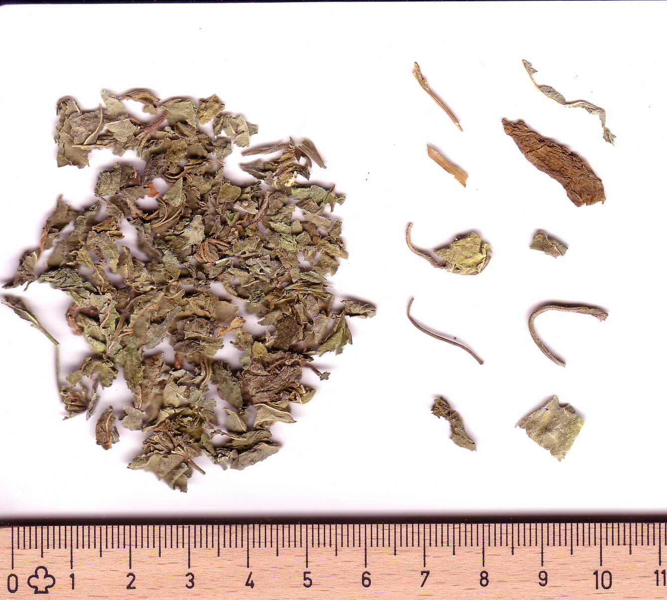 Mikroskopie: Büschelhaare, mitunter auch einzelne Haare; beide zugespitzt und mit dicker Zellwand; auf beiden Blattseiten finden sich ausgebuchtete Epidermiszellen; im Mesophyll sind Oxalatdrusen und Schleimzellen anzutreffen.
