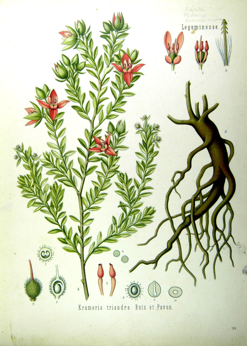 - Gerbstoffe: Proanthocyanidine, bei lägerer Lagerung enstehen aus diesen unlösliche Phlobaphene (Ratanhiarot siehe auch Tormentillae rhizoma)